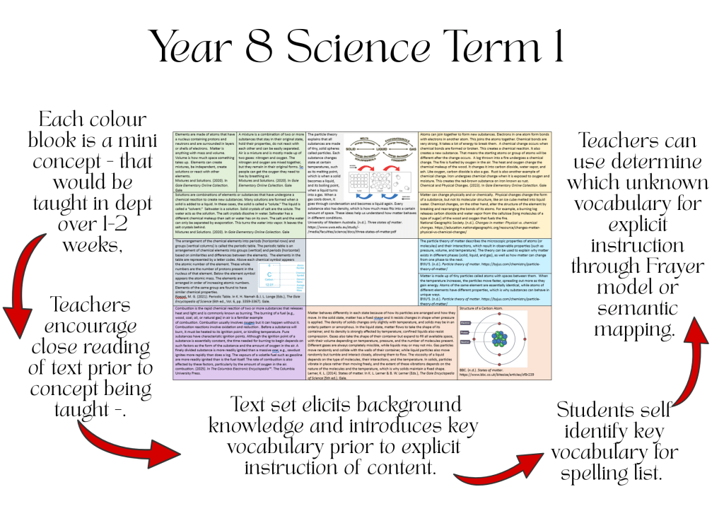 Text sets are an effective pedagogical strategy to improve vocabulary in a classroom because they encourage students to interact with a wide range of quality, genre specific texts throughout a unit of work.  These text sets were specifically curated to improve vocabulary and by extension, reading comprehension. Students were able to engage with short extracts of text that have been appropriately levelled prior to the unit commencing and then were able to re-engage with this text intermittently through the term.  This ‘dipping’ in and out of the content allowed students to activate their prior knowledge as well as exposed them to tier two and three terminologies at smaller and more regular intervals.  This intermittent exposure is ideal for spaced retrieval practice as teachers are able to regularly gauge the level of background knowledge and understanding the students already have on the topic and as well check for understanding.   Furthermore, these vocabulary text sets can be effectively used as text exemplars because they can be formatted to meet the disciplinary genre requirements.