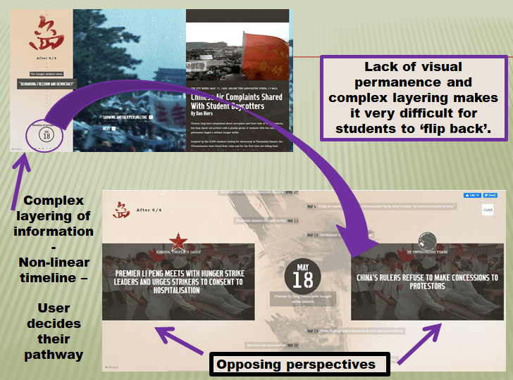 It is popular knowledge that video and computer gaming are very popular with teenagers, and After 6/4 challenges young people to utilise their transliteracy expertise for educational needs (Kopka, 2014). After 6/4 elicits the reader’s interest by requesting them to select their country of origin then linking to a range of multimodal media texts. Readers are further rewarded by additional information as they ‘click’ through the timeline. By offering language choices in both English and Mandarin, After 6/4 allows the reader to interact with the text without the need for a translator. The resource is further supported by subtitles which promotes literacy development and helps lower literacy students engage with the content material.