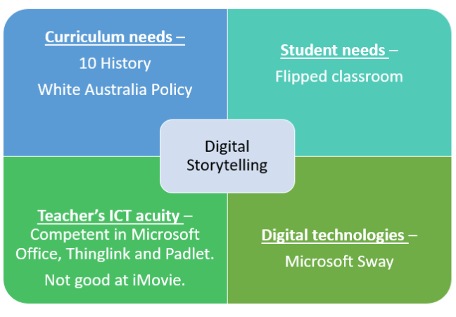 The White Australia Policy [Sway] is a linear interactive digital narrative that has two main purposes. The overt purpose is to assist students through the various perspectives of Australian and world history to understand the reasoning behind the legislation and implementation of this Policy. The variance in viewpoints allow the students to develop their own conclusion about this historical event using the range of primary and secondary sources (Lamb, 2011). The covert purpose of this narrative is to facilitate literacy development by promoting literacy, academic writing and critical thinking.