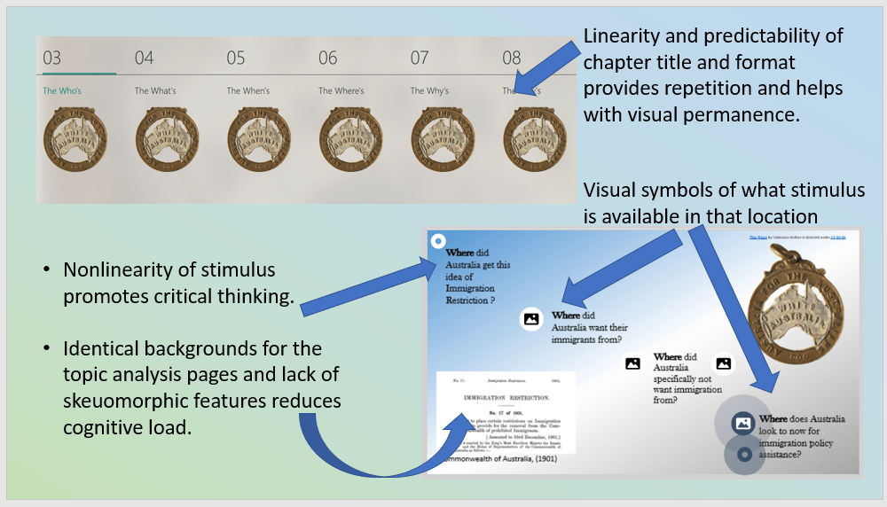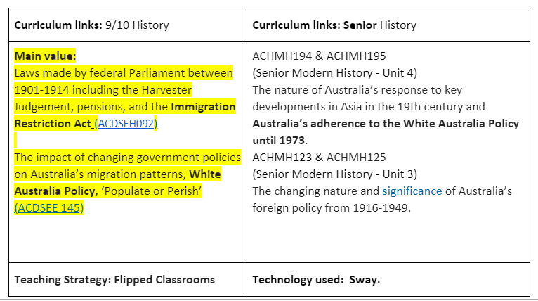 The Immigration Restriction Act of 1901 was one of the first pieces of legislation created by the newly formed Australian Federal Government and is the main focus of this digital narrative (DN).  Commonly referred to as the White Australia Policy (WAP), the Act was designed to maintain racial homogeneity and the economic value of the Australian man (Fong, 2018).   Whilst the Act is addressed in Year 10 History and Senior Modern History, the cognitive and curriculum focus of this DST is aimed at the 9/10 History Unit of work – Australia – From Federation to the Bicentennial  (ACARA, 2014a; ACARA; 2014b).  The utilisation of a multimodal DN in a  flipped classroom (FC) dynamic was a strategic ploy to encourage student ownership of learning, approach sensitive content suitably, promote collegial discussion, and allow the teacher to meet the needs of a diverse classroom (Gonzales, 2016; Schmidt and Ralph, 2016, p.1).