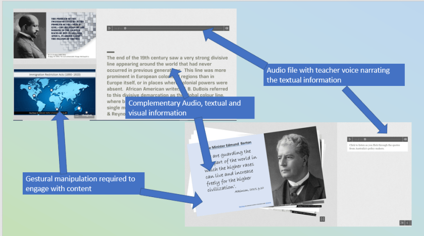 Digital technologies and multimodal resources (MR) are an integral aspect of DN and other modern classroom pedagogies (Ibrahim, 2020).  MR can be static, such as picture books and graphic novels, or dynamic such as SwayPowerpointThinglinkdigital textbooks, and interactive websites (Ibrahim, 2020).  This DN utilises Sway and Thinglink because the software programs embed together well, and their combined interactivity promotes engagement as well as encourage gestural manipulation to access information (Ibrahim, 2012; Heick, 2017).